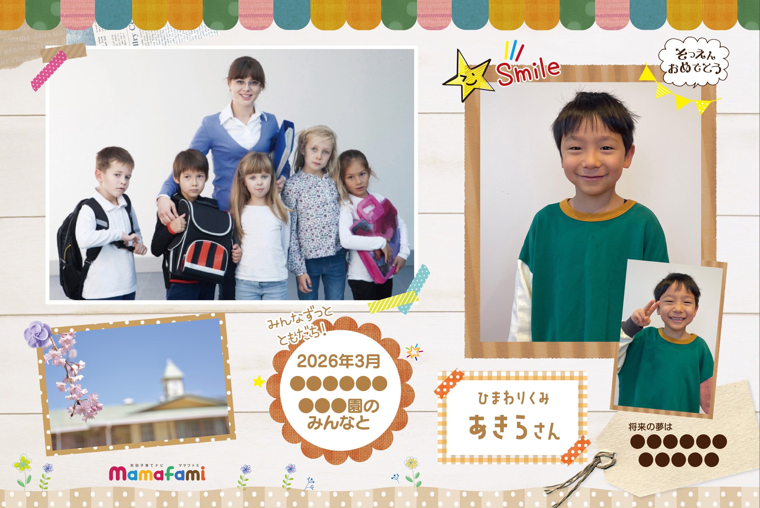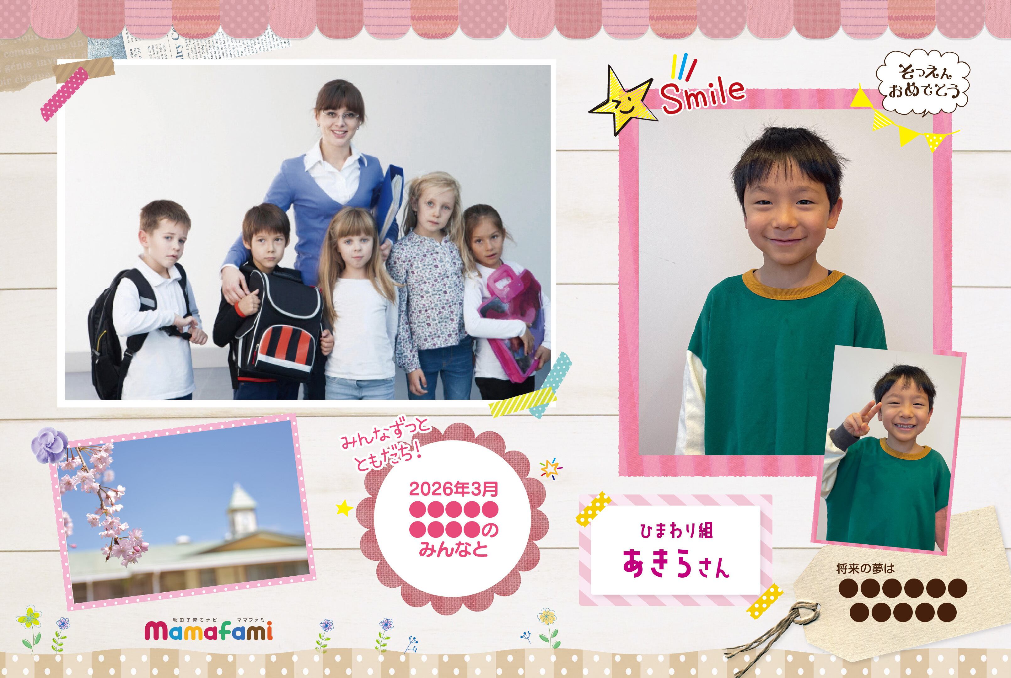 ・こちらの商品は情報誌「ママファミ 2026年卒園アルバム号」に掲載された秋田県内87園1,608名のお子様のご家族(ご関係者)さま向けの商品です