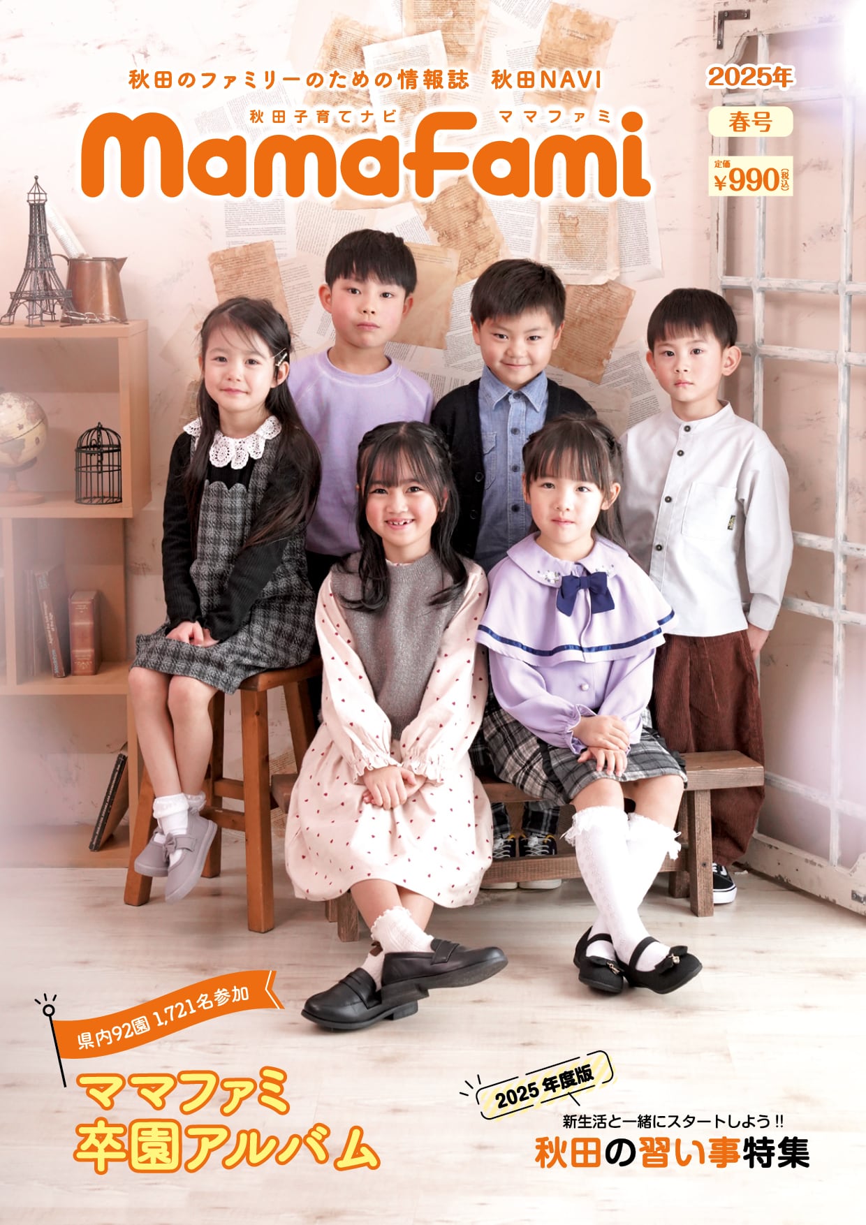 ママファミ卒園アルバム2025 秋田県内92園1,721名が参加した「卒園アルバム」です。 ※こちらは2025年3月発行のバックナンバーです 2025年度版 秋田の習い事特集も掲載